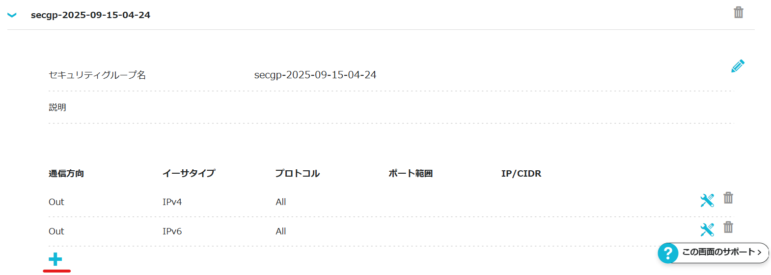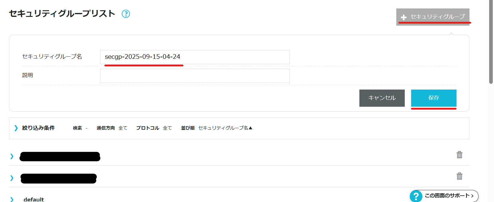 セキュリティグループは、右上の「+セキュリティグループ」をクリックして、セキュリティグループの名前(任意)を入力して右下の「保存」をクリックすればOKです。