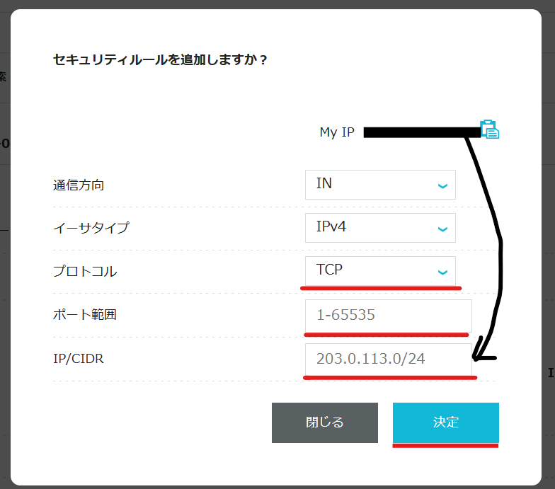 今Conoha VPSにログインしているネット回線(家のWi-Fiやスマホ回線など)のIPアドレスが表示されるので、そのIPをIP/CIDRの入力欄にコピペすると、そのIP以外でアクセスできなくなります。